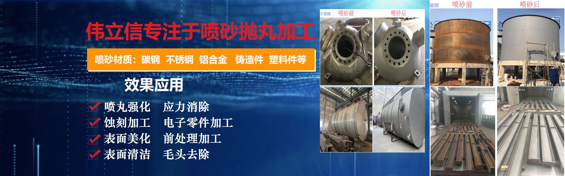 武漢偉立信機械設備有限公司(噴砂熱線:18186495283)是一家從事表面涂裝和表面清理設備的廠家,公司位于武漢市武昌區。是一家集表面涂裝和表面清理設備科研、開發、生產、銷售、服務于一體的綜合型企業。     公司自創建以來,一直秉持認真、負責的態度,以其科學而嚴密的管理,先進而不斷創新的技術,致力于表面處理設備的研制和開發,主要產品有:手動噴砂機、自動噴砂機、開放式加壓噴砂機、干濕式噴砂機及大型噴砂房,拋丸機,除塵設備,另可根據客戶要求定做。低價經營各類噴砂磨料:玻璃珠、鋼砂、鋼丸、不銹鋼丸、鋼絲切丸···